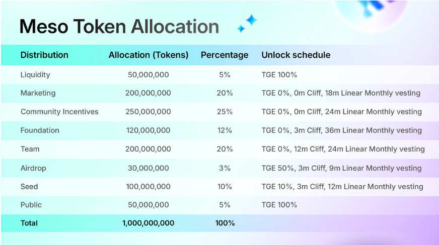 Meso Finance tokens (MESO) are allocated across the following main categories: